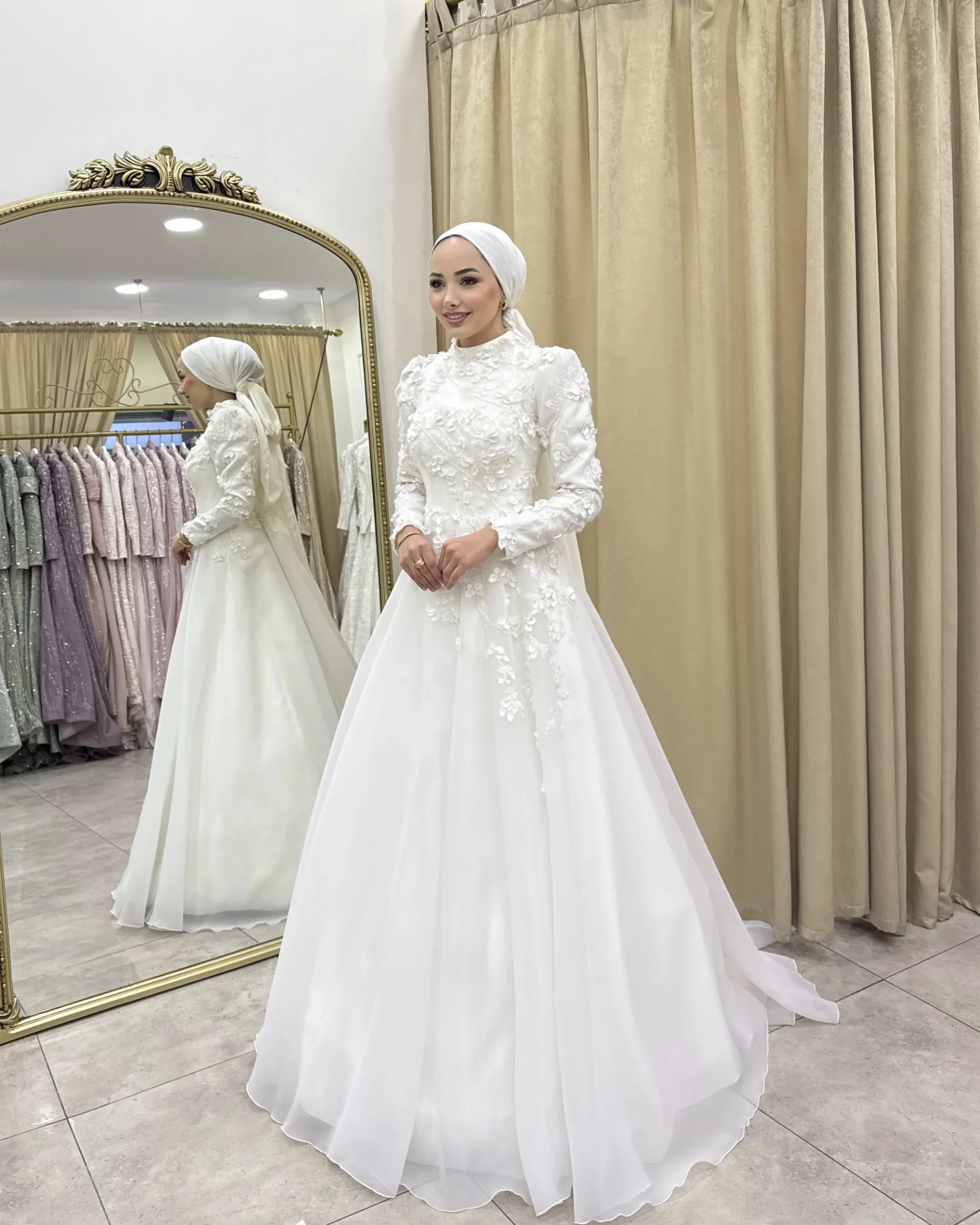 Saf ve romantik görünümüyle öne çıkan Helen, sade zarafeti üç boyutlu çiçek detaylarıyla buluşturan özel bir gelinlik modelidir. Üst bedende yer alan zarif aplikeler, gelinliğe feminen ve seçkin bir hava katarken; hacimli etek formu masalsı bir siluet oluşturur. Şıklığı ve sadeliği bir arada isteyen gelin adayları için etkileyici bir tercihtir.
