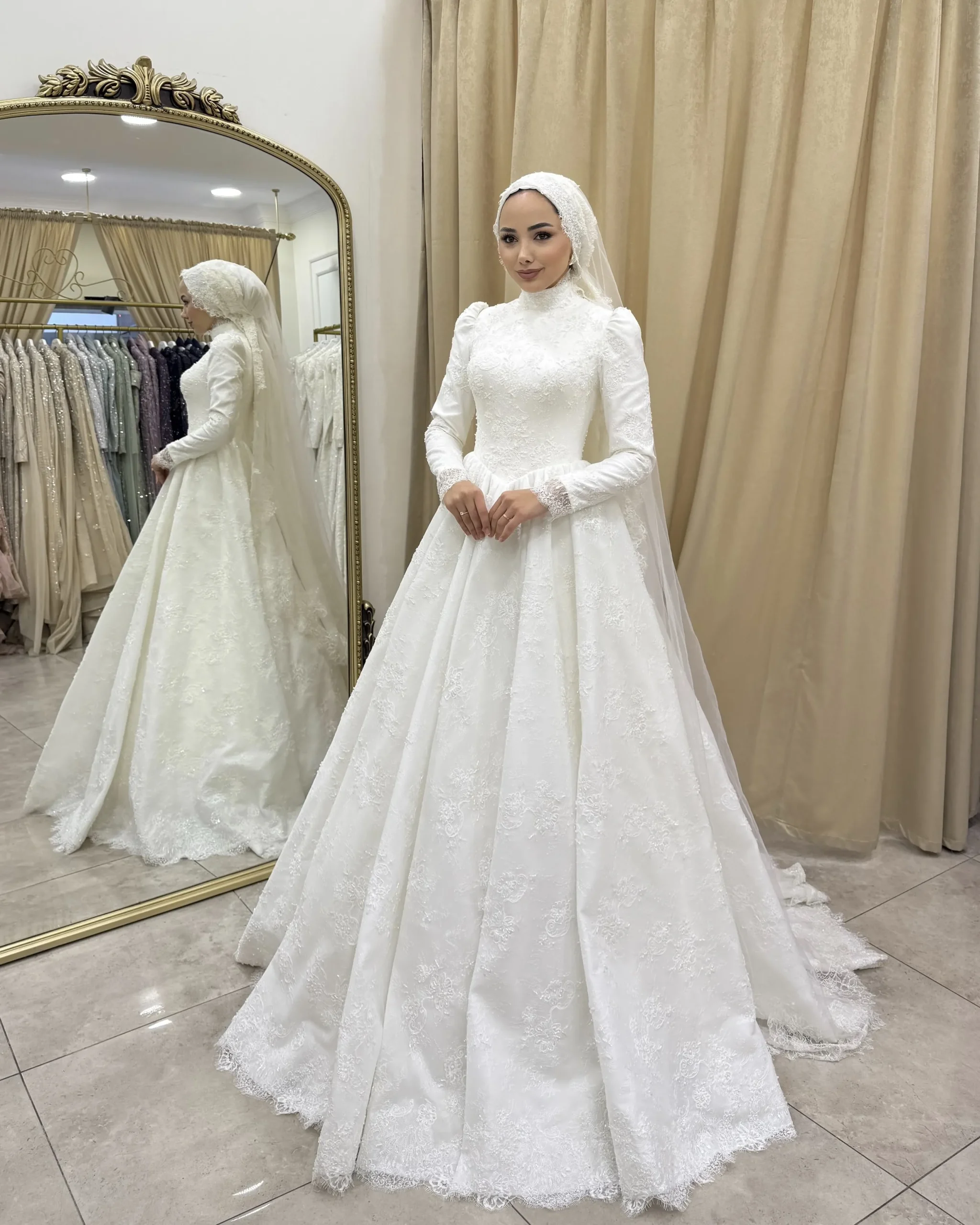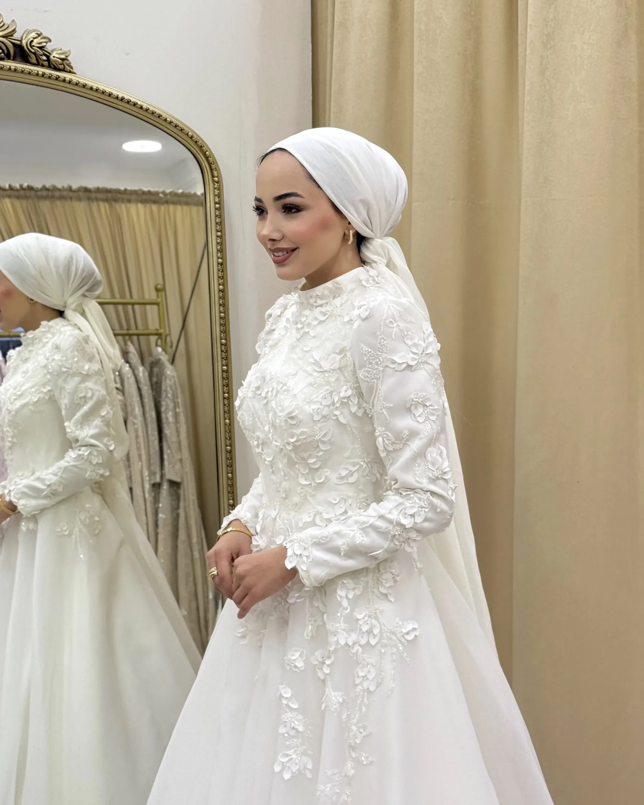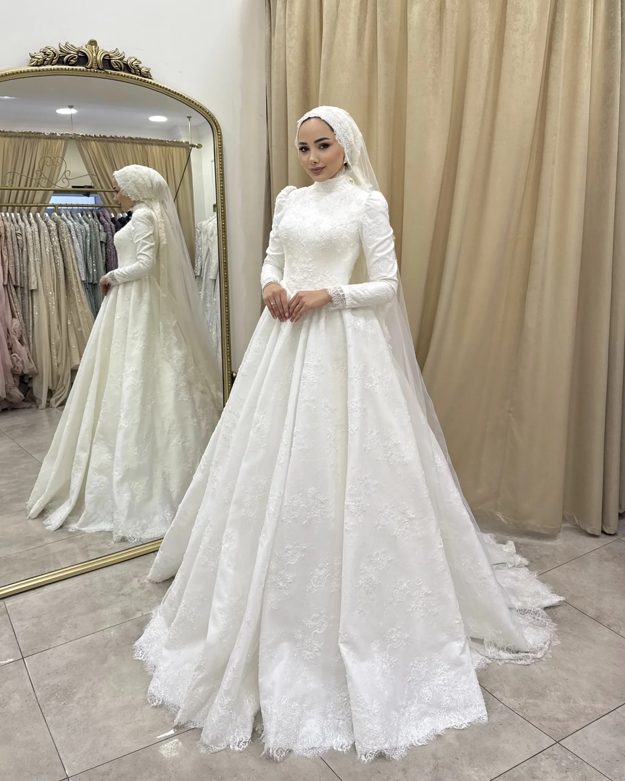 Romantik detaylarıyla büyüleyen Marceline, zarif dantel dokusu ve asil duruşuyla öne çıkan özel bir gelinlik modelidir. Üst bedendeki ince işçilikli dantel detayları ve omuzdan dökülen zarif pelerin formu, modele sofistike bir hava katarken; kabarık etek kesimi masalsı bir görünüm sunar.