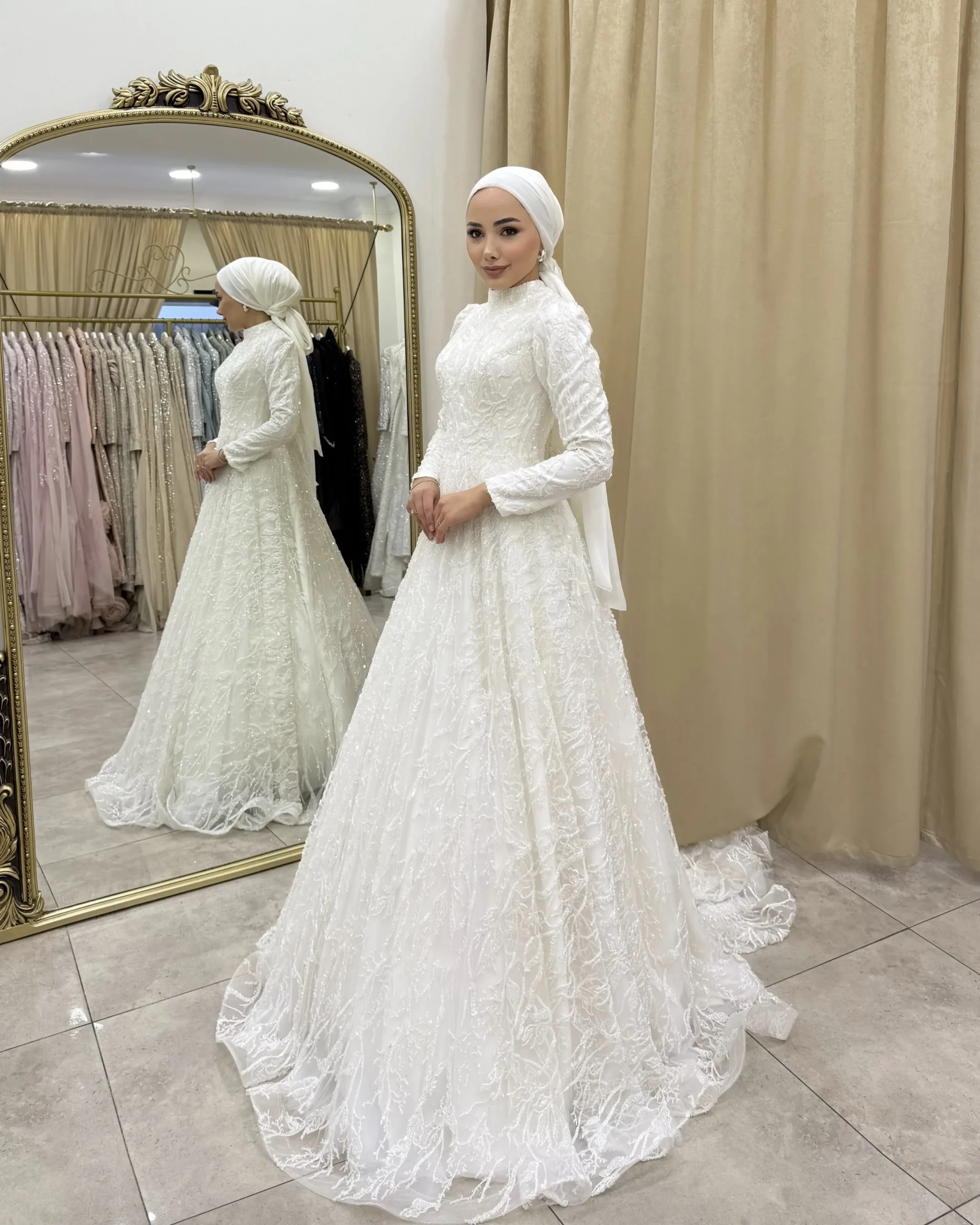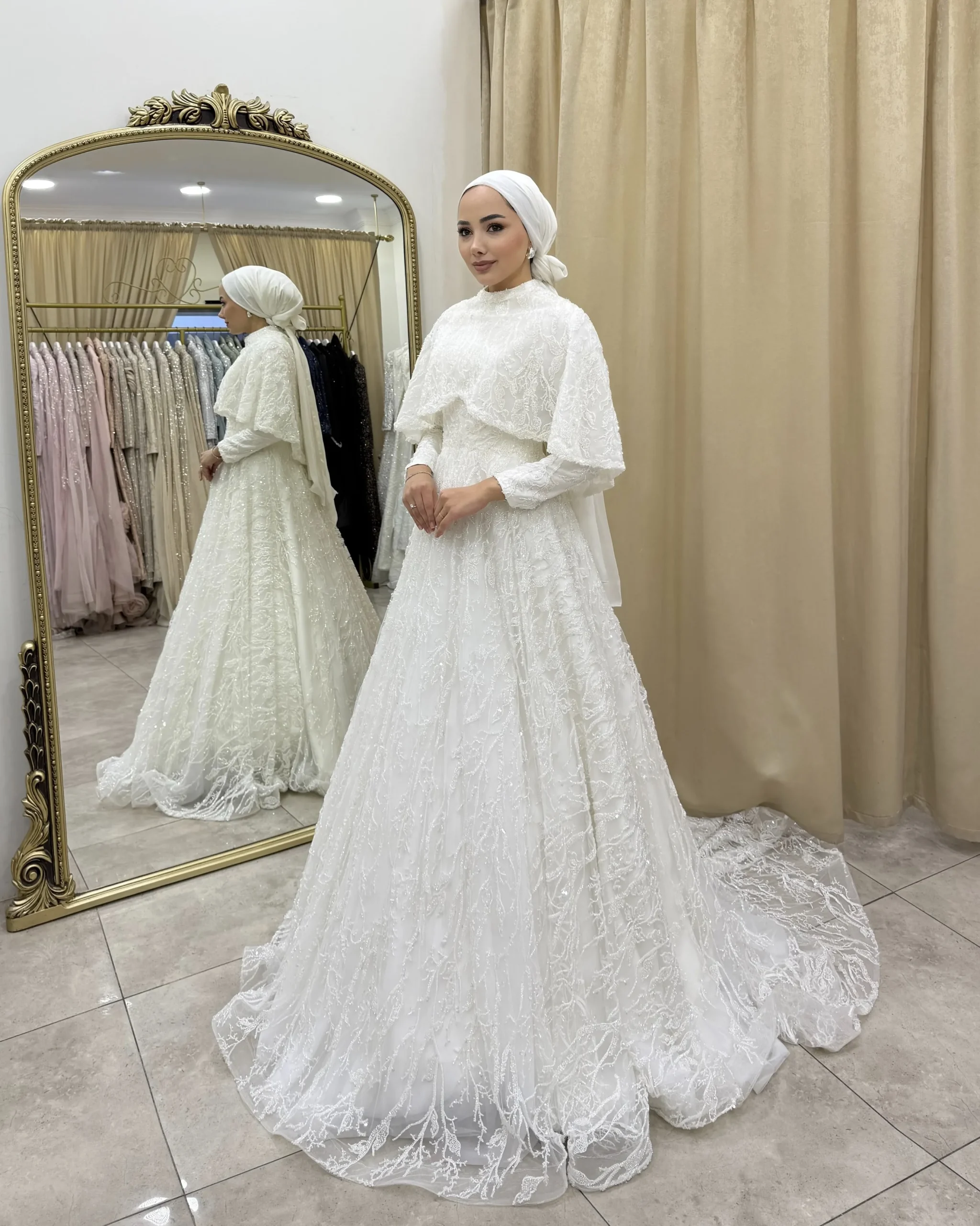 Göz alıcı dantel işlemeleri ve zarif pelerin detayıyla dikkat çeken Sienna, romantik ve ihtişamlı bir gelinlik modelidir. Baştan sona uzanan ince işçilikli desenler, gelinliğe sofistike bir ışıltı katarken; kabarık etek formu masalsı bir görünüm sunar. Modern ve klasik çizgileri bir araya getiren özel bir tasarımdır.